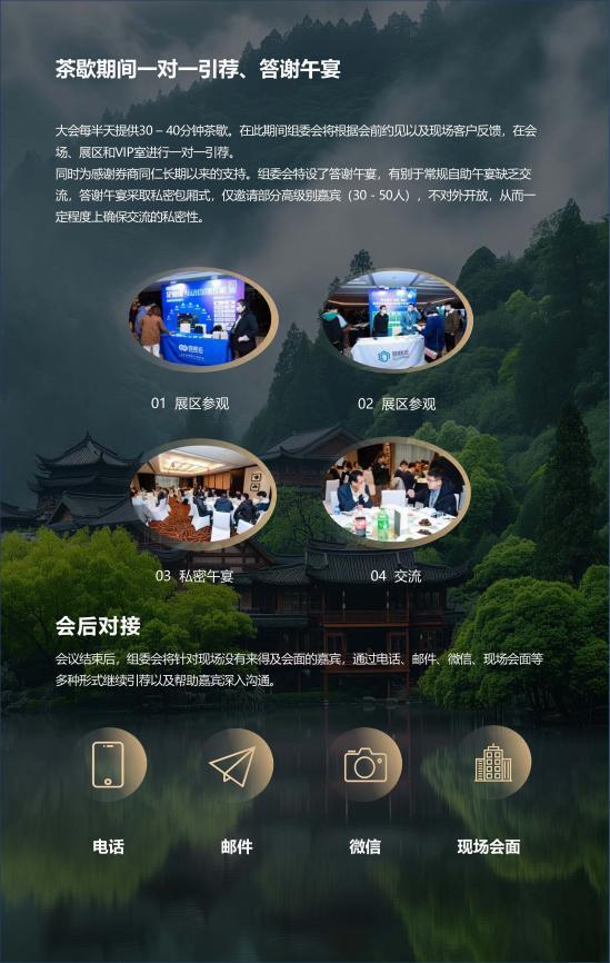 大会每半天提供30-40分钟茶歌。在此期间组委会将根据会前约见以及现场客户反馈,在会场、展区和VIP室进行一对一引荐。