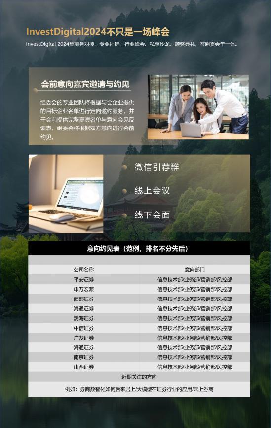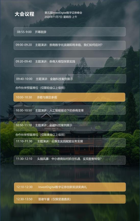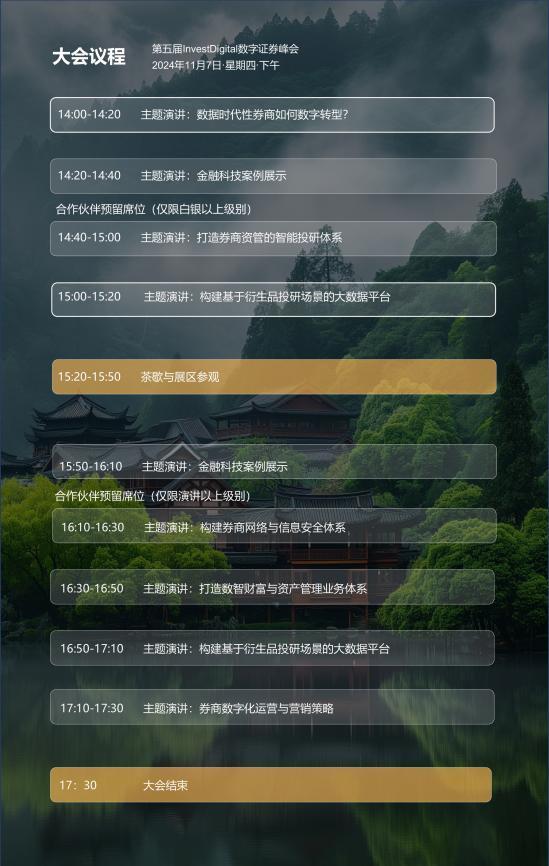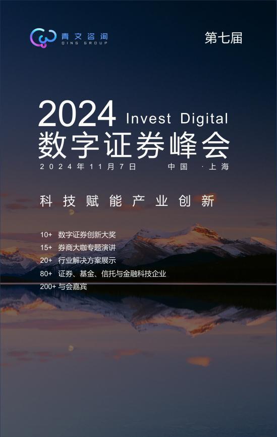 本次InvestDigital数字证券峰会将于2024年11月7日在上海举办,峰会将邀请200+行业嘉宾,涵盖80家国内外金融机构,共同探讨券商如何利用金融科技实现自身发展,探索财富管理、资产管理、业务拓展、公司治理、风险控制、产品营销等方面的数字化转型。本次峰会还将在百余家行业嘉宾的见证下颁发Invest Digital数字证券峰会10大数字证券创新奖,目前奖项开放申请中。如您有意向在大会上主题分享、申请Invest Digital数字证券创新奖、赞助大会、参与答谢午宴或有其他与会需求,欢迎通过文未联系方式与主办方联系!