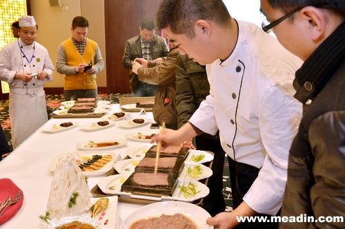 君澜酒店集团总裁王建平先生一套才华与学习、努力与转型的辩证功法如同当头棒喝,又如指路明灯,令众人豁然开朗。君澜酒店集团餐饮总监吴俊霖先生在会上通报了君澜集团餐饮中心整体运作框架和思路,并表示:集团餐饮中心将尽一切力量支持各项目酒店,确保各项目酒店顺利攻城略地,在其区域的餐饮界所向披靡等领导们纷纷发言。期间大家听得手痒,纷纷约好私下切磋技艺,18日晚上,“民间菜肴交流大会”,各分会大厨亮出自己的拿手绝活,十八般厨艺,比得好生激烈:米汤首乌仙蹄筋、双味麻虹鳟鱼、马帮玛咖黑山羊、西塘海陆空、有礼有鱼等等。各色菜式,用料生猛、造型清奇,一时间难分伯仲,几轮较量