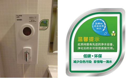 此外,在消费者比较关注的饮用水和空气质量问题上,如家也做了相应的应对举措。对于前者,如家酒店集团首创推出一系列做法。他们已经在全国280余家如家酒店、莫泰酒店直营店中逐步地取消客房瓶装水供应,取而代之的是新型的“直饮水系统”。直饮水可以直接入口饮用减少了二次污染,更有利于消费者的个人健康,同时直饮水的出现取消了塑料瓶的包装,减少了白色污染的产生。据悉这套系统的滤芯一次性可以过滤一万升饮水,而为了保证安全,每次过滤水总量达到八千升时酒店就会提前更换滤芯。