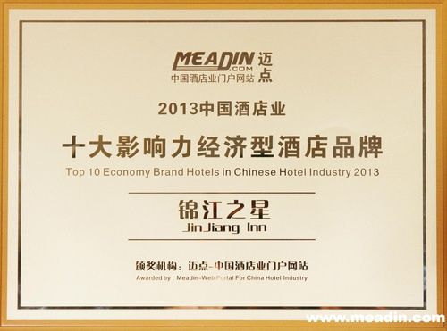 锦江之星获“2013中国酒店业十大影响力经济型酒店品牌”