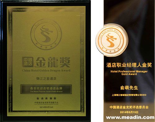 近日,2014第七届酒店职业经理人国际精英全球论坛暨中国酒店金龙奖颁奖典礼在杭州浙江饭店举行,论坛同时进行了第七届中国金龙奖颁奖典礼。锦江之星酒店凭借其近18年来塑造良好品牌形象和多年来行业内消费者最高的满意度荣获了最受欢迎连锁酒店品牌。与此同时上海锦江都城酒店管理公司CE0(原锦江之星CEO)俞萌先生也荣获了酒店职业经理人金奖。