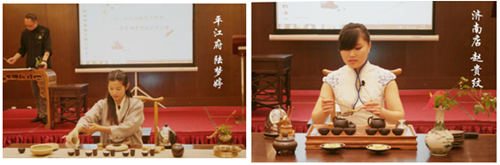 赛前集团不仅组织了茶艺培训并制作成教学光盘,还拍摄制作了由“诗礼使者”拍摄的茶艺视频发至各酒店进行学习。从对茶道一知半解、到能够进行茶艺表演、解说,期间手法娴熟、措辞精准、表演形式丰富独特,这都离不开参赛选手的深学苦练。最终由冠云大酒店、平江府和济南店荣获一二三等奖。