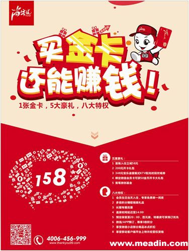 为了彰显和回馈高忠诚度会员的价值,本次金卡上市推出了360度优惠方案:入住立减、开卡礼包,赠送欢唱券等等。会员生日当天入住,专享价值百元免费房一晚,获赠加入金卡会员组织“U圈”资格,在尚客优微平台免费开店,共享尚客优百万会员,千家门店的流量资源。