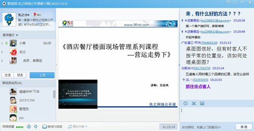 2014年8月28日下午2时,学员期待已久的第十期先之网络公开课如约而至,本次公开课《酒店餐厅楼面现场管理系列课程——营运走势控制(下)》继续由吴春凤讲师精彩授课,并取得了圆满成功。