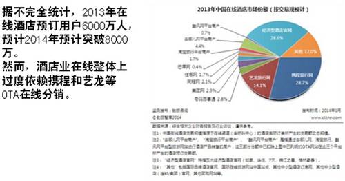为什么要用云服务,我们先看看酒店互联网市场。2013年在线酒店预订用户6000万人,预计2014年预计突破8000万。 然而,酒店业整体上过度依赖携程和艺龙等OTA在线分销。