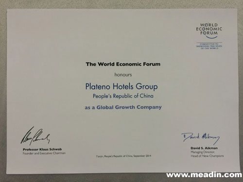 铂涛酒店集团荣膺世界经济论坛“全球成长型公司“荣誉证书