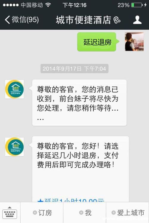 张先生到武汉出差,入住城市便捷酒店。次日,张先生和甲方敲定了一次合作,大家共进午餐,相谈甚欢。席间张先生习惯性的抬手看了下表,呀!还有五分钟就到酒店退房的时间了!赶快打电话——可是张先生既记不住酒店的电话号码,又忘记了入住分店的准确名字。这可怎么办呢?没关系——只见张先生掏出手机,打开微信,点击城市便捷酒店服务号,对着手机说了句:“我要延迟退房”。一秒钟之后,他的微信收到一条信息:“尊敬的客官,您好!请选择延迟几小时退房……”在选择了“1小时”并通过微信支付了费用之后,张先生成功把自己的房间延迟了一个小时退房。