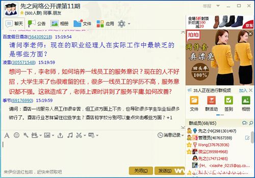 3时15分,讲师授课结束,进入学员们提问环节,在主持人的主持下,有麦克风的学员纷纷点击上麦按钮,依次进入语音提问,李勇老师在线为学员们解答。现场没有麦克风的学员也纷纷以文字的形式在聊天区进行提问。