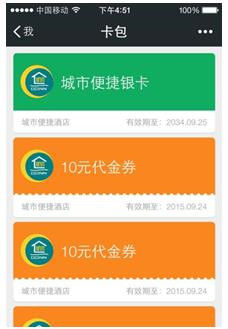 伴随着新版本微信的正式面世,用户们发现在微信钱包的功能下,多了一个卡包的选项。通过卡包,用户可以把各种会员卡、优惠券等保存到云端,省去随身携带的大量麻烦。此次新功能面市,微信在不同行业均选择了一、两家重点合作企业进行试水,如南航、麦当劳等。其中,城市便捷酒店成为了微信卡包在连锁酒店业的第一家落地企业。
