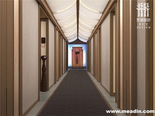 迈点网:酒店走廊部分,墙面木质,以及墙上的布艺装饰,是过去江浙地区较为常见的。这些材料都源自哪里?为什么要营造一种比较简朴幽暗的色调和感觉?