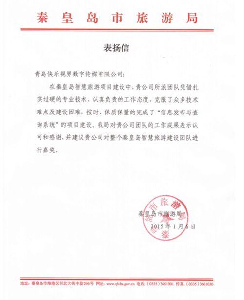 酒店作为传统的服务行业,对服务自然有非常高的要求,快乐视界作为酒店的服务商,对服务的要求更是近乎苛刻,想酒店所想,急酒店所急。正所谓一份付出一份回报,快乐视界因优秀的服务获得了青岛涵碧楼、青岛黄海饭店以及其他城市酒店客户的交口称赞。最近,快乐视界为秦皇岛打造的智慧旅游项目顺利验收,公司团队认真负责的服务态度等,更是得到了秦皇岛市旅游局高度评价。