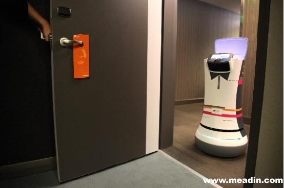 这台机器人会使用传感器来定位房间和人。它能通过Wi-Fi叫电梯,当抵达客人的房门口时,它则会使用手机系统来发出提醒,并呈上客人需要的物品。