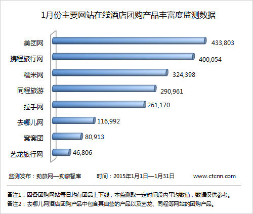 《2015年1月份主要网站在线酒店团购产品丰富度监测》报告显示,2015年1月份美团网的酒店团购产品数量以433,803单排名第一。
