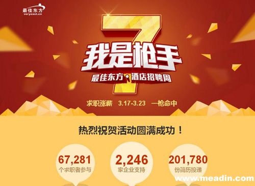 截止3月23日,酒店招聘周活动在线投递简历数量高达201780次,按照平均每人投递3份简历计算,至少有6.7万人在最佳东方上投递了简历。