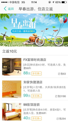 记者在活动页面发现,参与活动的既有如家这样的快捷酒店,又有柠檬树这样的家庭旅馆,还有北京圈子国际青年旅舍,还有如意这样的农家院,可供各种用户群体的选择。
