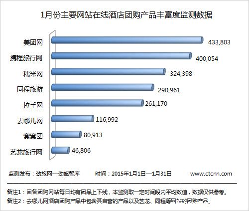 主打本地生活服务的美团在酒店领域以团购切入进入分销市场,在中低端酒店、客栈、小时房领域建立了很大影响力,其品类数量远远领先行业,劲旅咨询最新发布的《2015年1月份主要网站在线酒店团购产品丰富度监测》报告显示,美团网的酒店团购产品数量以433,803单连续5个月排名第一,环比增长14.8%。