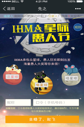 首先,进入首页找到你的专属星球,飞船带你到达神秘星球后,完成任务获得愚人值,愚人值越高,与你朋友在愚人大PK中获胜的几率越高。其次,你可以选择其他星球,进入愚人大PK,获胜者即可获得太空币,并可换取相应的IHMA代金券。最后,你还可许愿,说不定明天就成真了!