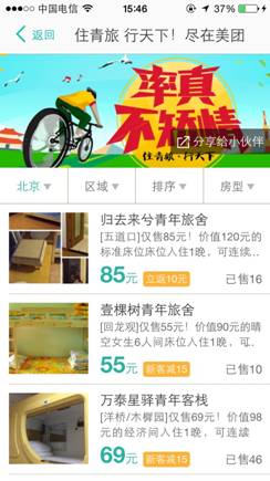 近日,美团网推出“住青旅行天下”活动在北京、成都、桂林、丽江等城市展开,记者发现,五道口的归去来兮青年旅舍仅售85元。