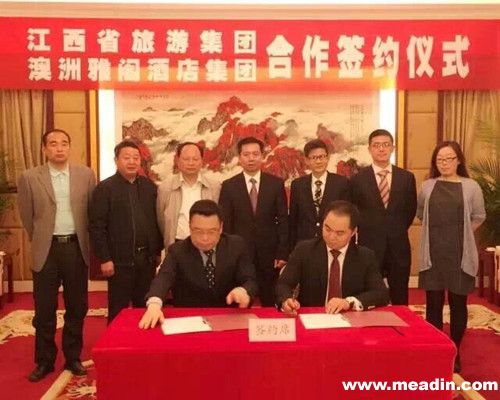 2015年4月20日,雅阁酒店集团(澳大利亚)与江西省旅游集团公司(简称“江旅”)在江西饭店签署了合作协议,双方将共同出资组建江西雅阁国际酒店管理公司,助力江西省酒店品牌及服务能力的全面升级,同时双方也将探索在养老地产市场的创新合作。
