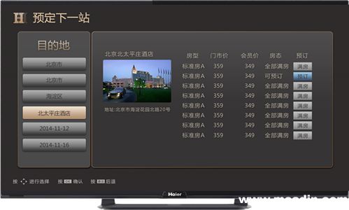 很多客人在离店之前需要预定酒店,或者订车、订票等。客房内的“智慧e房”酒店智能互动电视可以帮助客人预订同集团或同联盟旗下的其他酒店,客人可以通过电视查阅到航班或车次信息,并进行预订。此外,电视内还有丰富的旅游资讯供客人参阅。