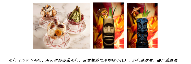 圣代(巧克力圣代、焰火焦糖香蕉圣代、日本抹茶以及樱桃圣代)、迈代鸡尾酒、僵尸鸡尾酒