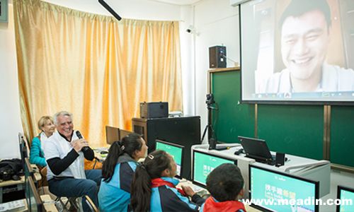 姚明则在视频对话中对学生们说道:“非常开心和你们交流,希望大家喜欢这个电脑室和图书室,并且可以多多使用它们。另外我也特别期待将来能看到新建的教学楼。最后希望你们健康快乐地成长。”