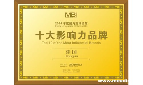 在迈点网主办的“酒店业最具影响力品牌颁奖盛典”上,首旅建国酒店集团旗下“建国”品牌荣获2014年度国内高端酒店十大影响力品牌奖项。