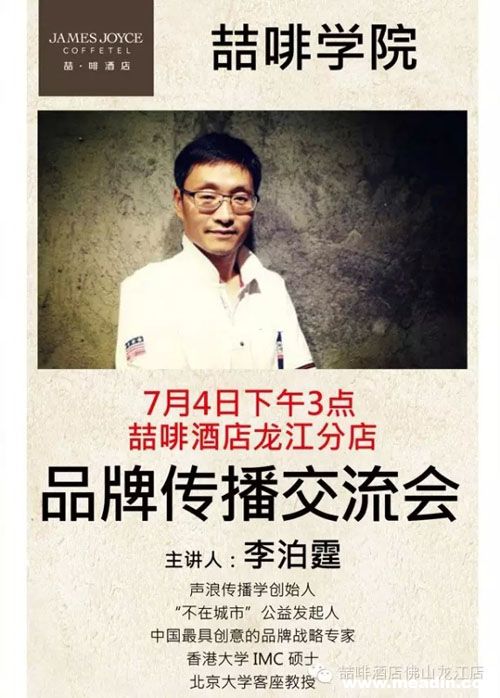 7月4日(本周六)下午3:00,中国最具创意的品牌战略大神,声浪传播学创始人—李泊霆先生来到喆啡 佛山龙江店,面对面和大家分享交流品牌营销的心得。