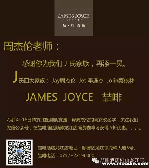 关注龙江喆啡酒店公众号,转发图片到微信朋友圈,帮周董的小闺女改名字,即可享受咖啡5折优惠!