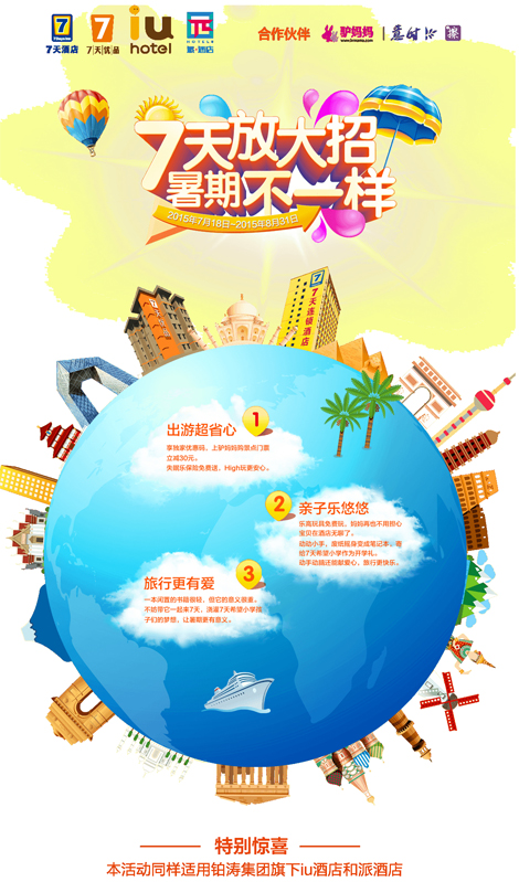 对孩子和家长而言,暑期亲子游都是和世界进行亲密接触的好机会,有限的资金应当用出无限的可能来。7天与自助游产品预订及资讯服务平台“驴妈妈”达成合作,住客在驴妈妈购买景点门票可享受30元减免优惠,免去爸爸妈妈四处搜寻比价之苦,省心、省事又省钱。同时,7天更牵手互联网旅行安全服务公司“意时网”,为住客送上新奇的失眠乐保险,在店内没睡好便可进行“索赔”,虎妈猫爸们再也不用担心被自家熊孩子吵得失眠又无处诉苦啦。