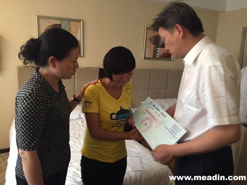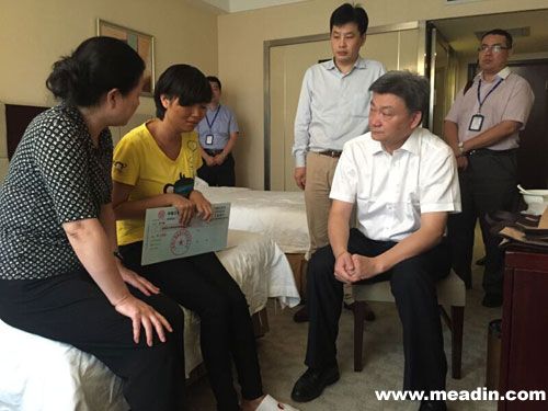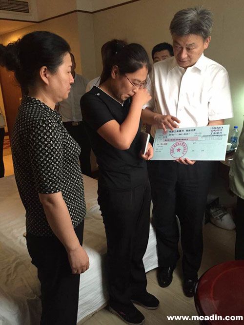 图注:锦江都城酒店管理公司副总裁徐总一行代表公司将爱心捐款交给英雄尹艳荣的妻子罗女士