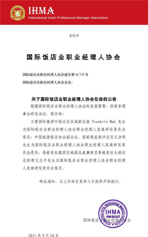 国际饭店业职业经理人协会发布多项任命公告,任命Franklin Mak、王济明、文志平为国际饭店业职业经理人协会职业经理人发展研究委员会委员。