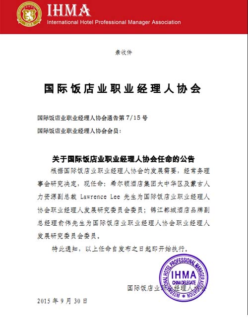 IHMA任命金希尔顿酒店集团大中华区及蒙古人力资源副总裁Lawrence Lee、锦江都城酒店品牌副总经理俞伟为委员。