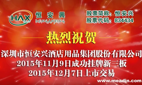 11月9日深圳市恒安兴酒店用品集团股份有限公司收到全国中小企业股份转让系统同意其挂牌的函,12月7日正式挂牌上市交易(简称:恒安兴,股票代码:834434),深圳市恒安兴酒店用品集团股份有限公司也成为中国酒店用品行业首家登陆新三板的企业,也是建筑装饰业首家专注于高端酒店全域空间软装饰方案提供的新三板企业,同时,恒安兴也是中国酒店用品行业首家登陆国内资本市场的企业。