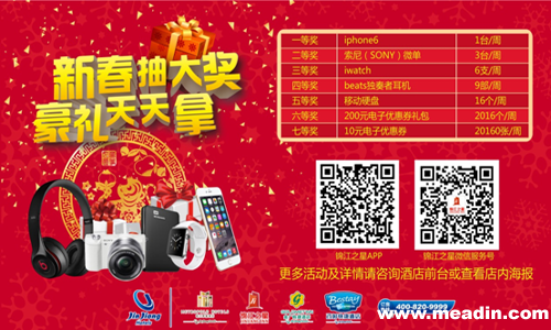 2015年12月12日至2016年2月29日,会员通过锦江都城公司官网、APP、微信服务号(jjinns2013)预订并入住旗下各品牌酒店后,自第二天起一周内可通过官网、APP、微信服务号参与“新春抽奖”活动