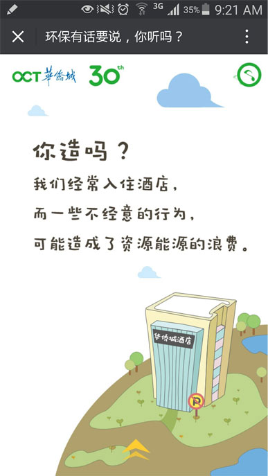 以深圳威尼斯酒店数据为例,清洗1块方巾、1件浴袍与1床被套,总共会消耗1.4度电、0.15m³冷水、0.05m³热水和2.45m³蒸汽,年累计能源消耗量将非常庞大。因此,客人的良好住宿习惯,不仅是个人素质的体现,更是在为低碳节能尽力。今年正逢华侨城深耕文化主题酒店15周年之际,通过微信朋友圈流行的H5动画导入线上游戏,与华侨城酒店环保主题相结合,引导大众齐筑绿色环保梦。