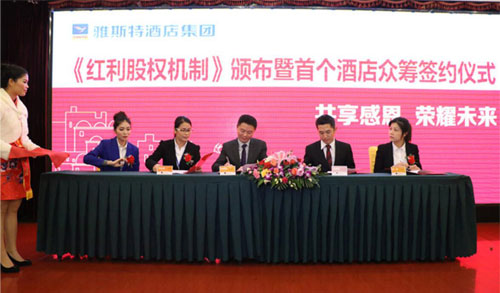 雅斯特举行《红利股权众筹机制》颁布暨首个酒店众筹项目签约仪式,以雅斯特酒店PLUS品牌旗下南宁火车站店为启动项目,现场众筹200余万元。