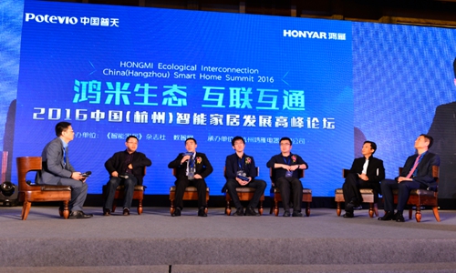 论坛对话环节,鸿雁电器总裁王米成、华为消费者BG战略合作投资总监庾征、京东微联运营总监张卫锋、乐视网解决方案部总监刘彩俊、亚厦装饰董事会秘书、副总裁吴青谊、亮美嘉(中国)灯饰连锁机构董事长聂庆东和中国智能家居产业联盟秘书长周军共同探索智能家居行业的现状和趋势。