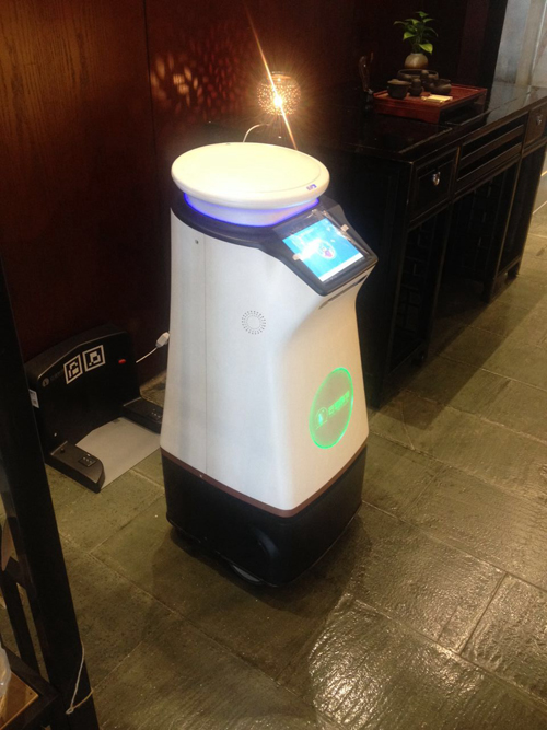 在苏州三香路的书香门第酒店里,机器人作为智能服务工具已经在餐厅里工作,没有轨道没有手臂的机器人给酒店客人带来惊喜。