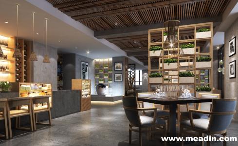 美豪丽致花园酒吧茶餐厅,在开放的空间场所嵌入不同功能,有酒吧、自助餐、SPA、高尔夫练习场、游戏机,还有商务办公设施,既是互动交流的空间平台,又不失优雅的私享性。