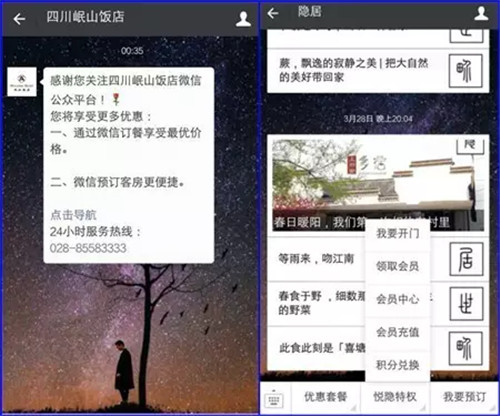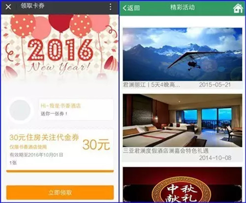 相对于电脑端酒店官网而言,微信端的优势之一就是互动营销更加便利、实现形式更加多样、实际效果更加明显。比如,关注公众号送红包或者房券,如果酒店有需求,还可以将卡券与微信卡包相关联。