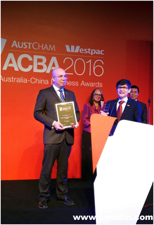 “澳大利亚商会中澳商业大奖(ACBA)”是每年由中国澳大利亚商会非盈利承办的最重要奖项,是专门肯定在华发展的,为澳大利亚及中国两国做出杰出商业贡献的企业而设置,至今已有23年历史。澳洲驻华使馆全程参与ACBA评选,包括澳大利亚前总理等政府官员参加历年颁奖大典,其公正、严谨性为澳洲主流社会及在华国际企业所称道,亦获得澳大利亚驻华使馆的认可与支持。