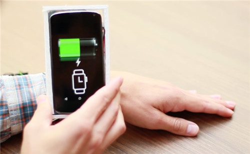 除了支持手机,PowerShake 还可以集成在智能手表或者手环中,如果你想用手表测一下心率但手表本身没电了,还可以直接把一部有电的手机放在这块手表旁边,就可以给它充电了。