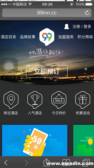 4月18日,99旅馆连锁H5预订系统“99微官网(m.99inn.cc)”正式上线。本系统主要打造轻巧、便捷的住房预订功能,同时为客户提住宿酒店周边饮食、旅游、娱乐等多层次的内容,供消费者选择。99旅馆连锁微官网,是99旅馆连锁官网、99掌上APP、99旅馆连锁微信公众号(jiujiuliansuo)之后,又一自有预订渠道。通过本渠道,可实现99旅馆连锁及其姊妹品牌99优选酒店、99新标酒店的客房预订等服务。