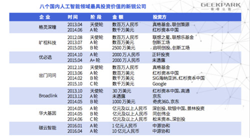 在这其中,既有格灵深瞳和旷视科技类的现实应用服务解决商,也涉及到华大基因和碳云智能这类的未来技术研发商,他们一道组成了国内人工智能领域未来发展的不可忽视力量。