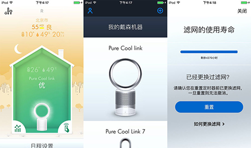新加入的手机应用 Dyson Link 提供远程打开、关闭,监控空气质量,还有监控滤网等功能。