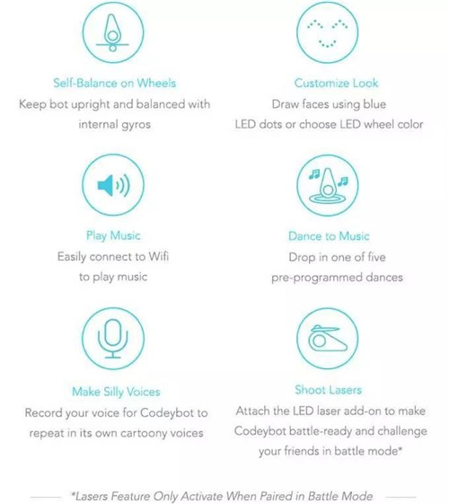 自定义外观:玩家可以通过蓝色LED「画」出Codeybot的面部表情,也可以改变它轮子的颜色。