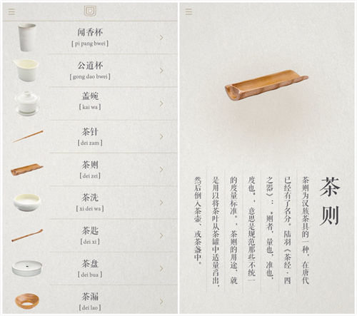 「器」介绍了在功夫茶中常用的一众茶具,包括了「闻香杯」、「公道杯」、「茶则」、「茶洗」、「茶漏」、「茶垫」、「茶夹」……等等熟悉或陌生的茶具,点开每个单独介绍后会看到简单的茶具由来介绍和使用方法。例如「茶则」的介绍中就告诉我们早在唐代陆羽的《茶经》中有过记载,用于度量茶叶然后倒入茶盏。