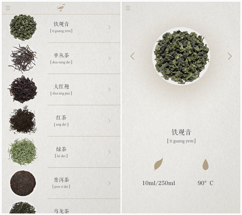 「食茶」是一款介绍潮汕人「功夫茶」文化的 App,由一名广州美术学院的学生完成的毕设作品,甚至还得到了 App Store 的首页推荐。它提供了针对不同茶品的最佳冲泡时间和水温,以及更多关于茶具、品茶、茶史的简单科普,足够致用的知识以及不至于太多造作的内容是其特点。